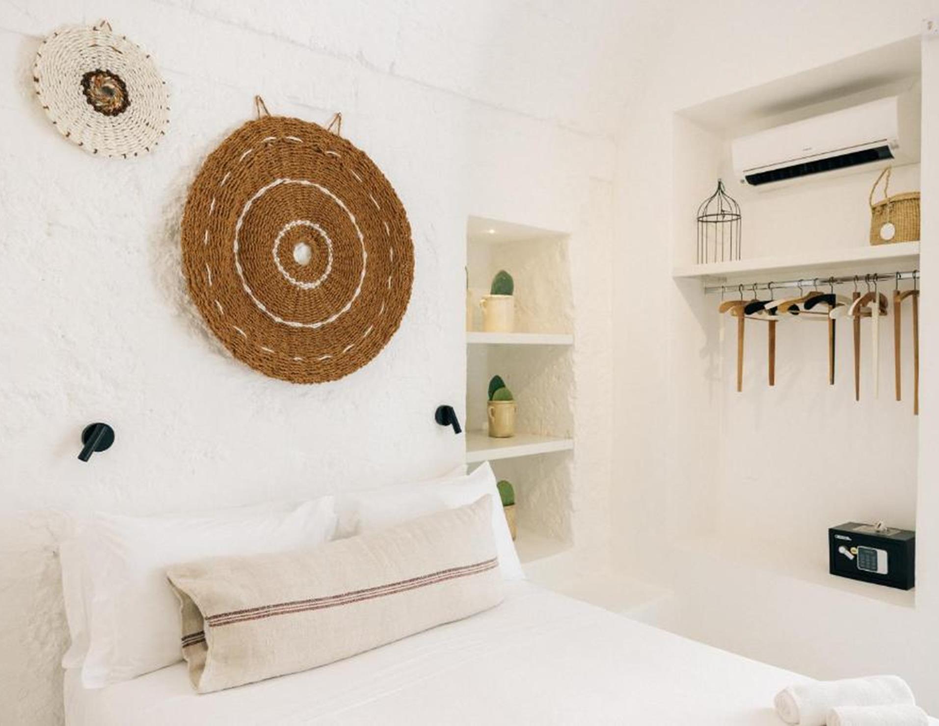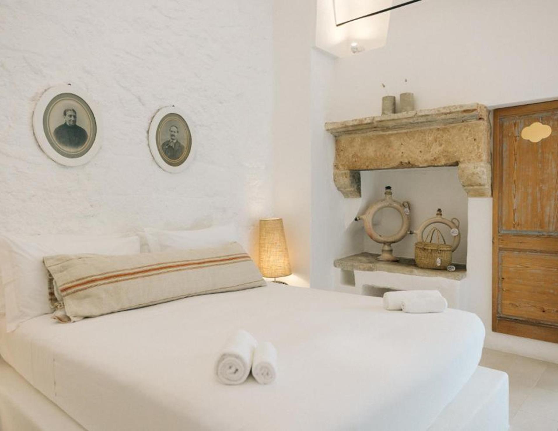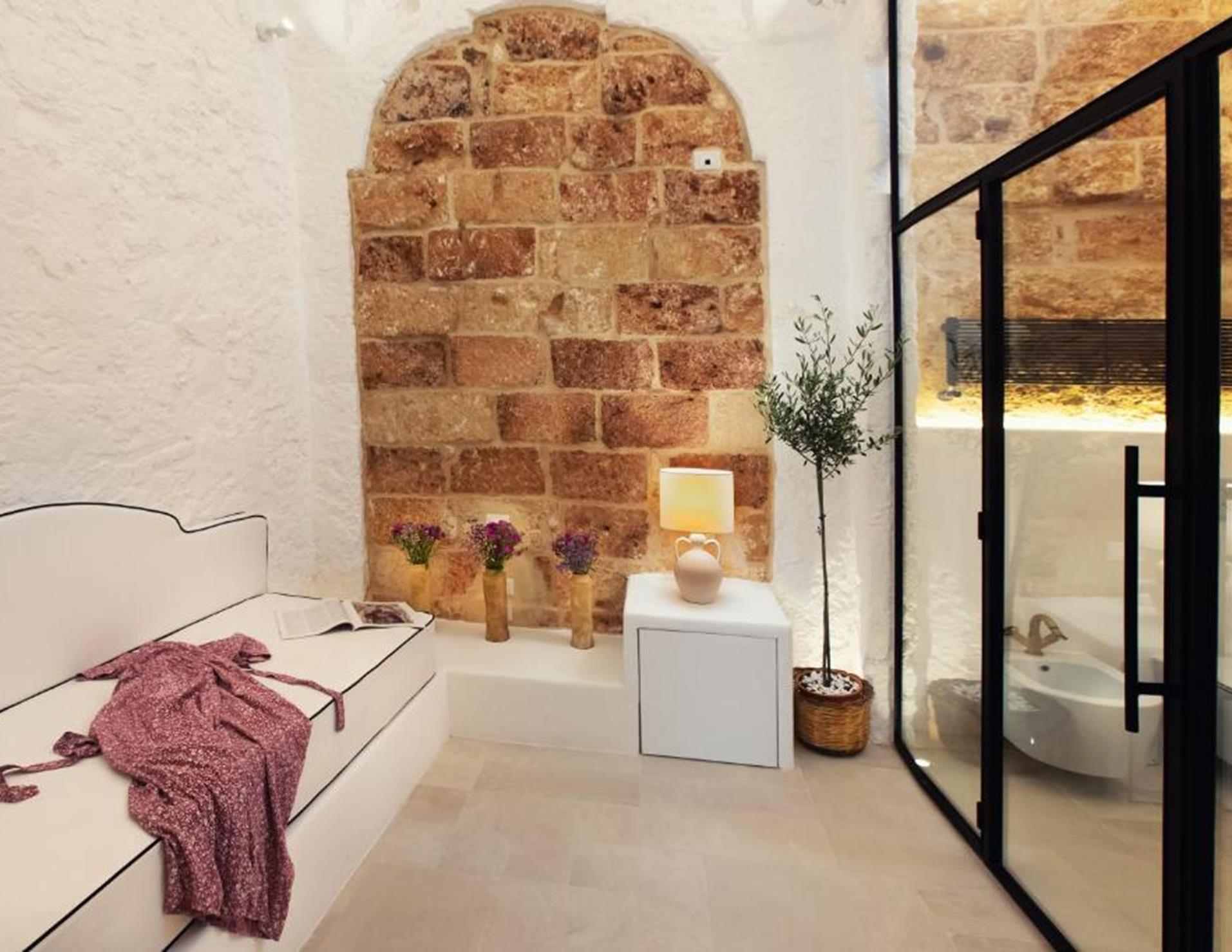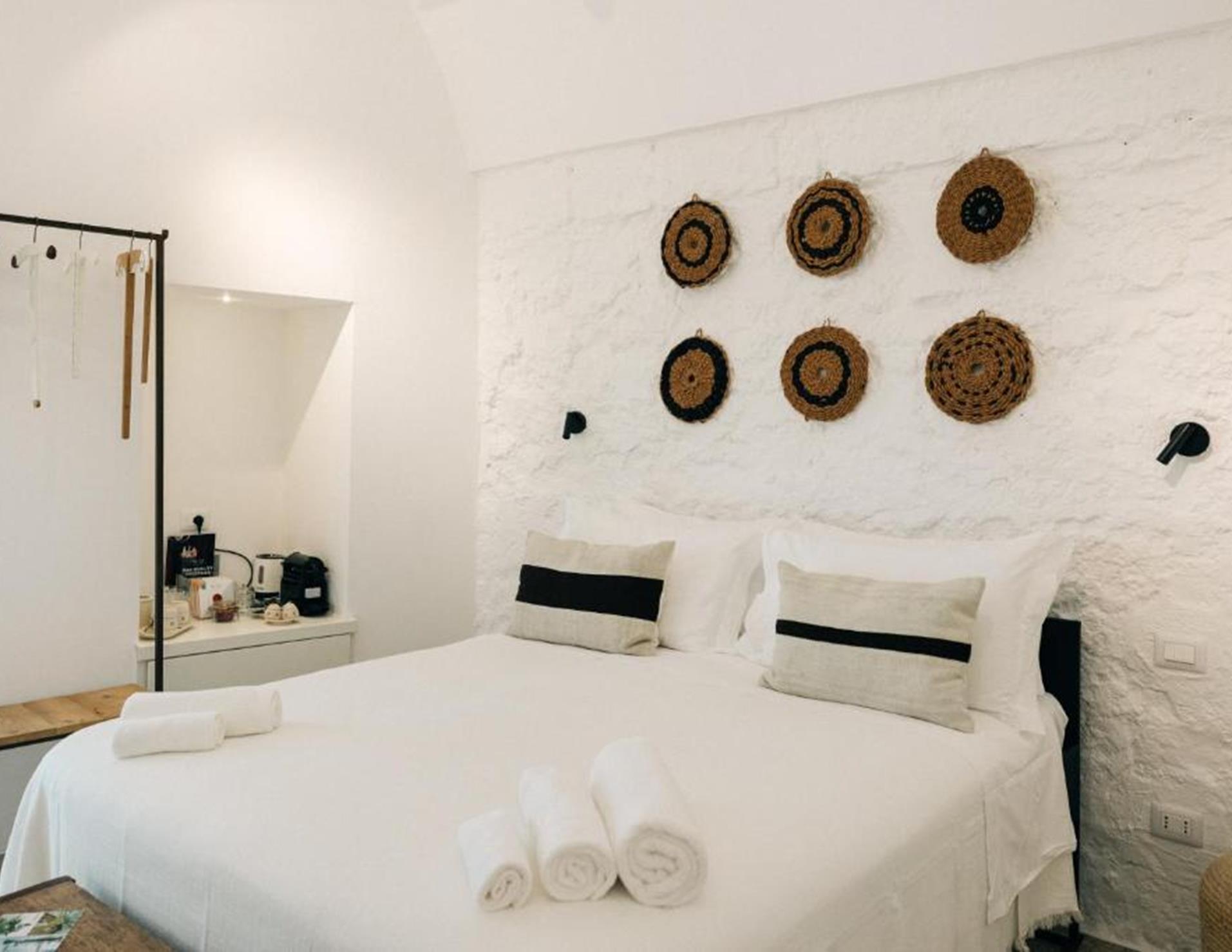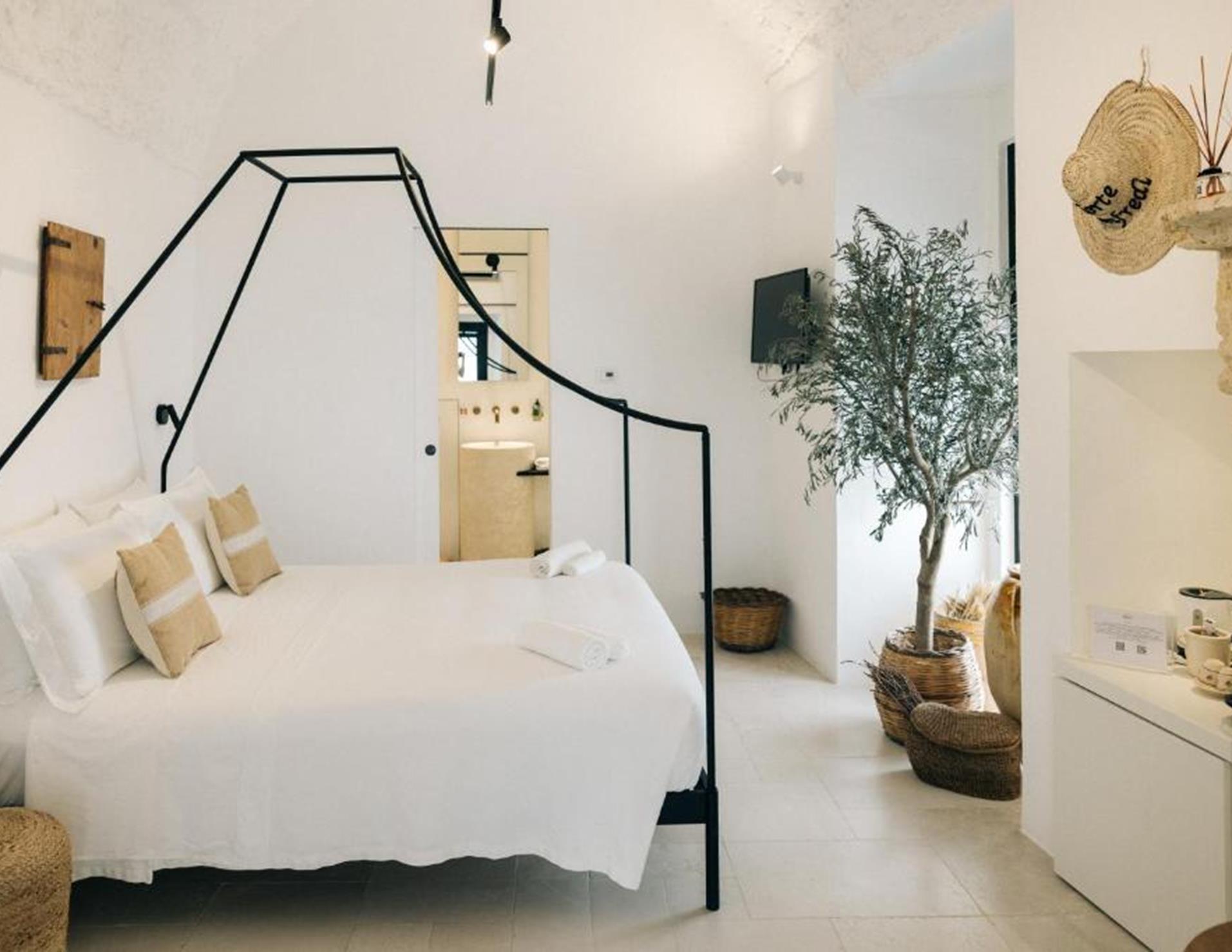 Camere: 5, tutte con ingresso indipendente e porta finestra di ingresso, tra Standard/5A, al piano terra, matrimoniale con volta a botte e letto artigianale in ferro battuto, Camera Tripla/5B ** al piano terra, caratterizzata da una tipica volta a botte, dispone di letto matrimoniale e divano letto singolo, **Doppia con vasca/6B al piano terra, dispone di letto matrimoniale, sala da bagno con elegante vasca da bagno a sfioro, doccia e porta finestra di ingresso come unico punto luce della camera, Superior/6A al piano terra, matrimoniale con volta a botte bianca e letto matrimoniale a baldacchino, Superior Primo Piano/7B **, spaziosa e raffinata, impreziosita da oggetti antichi restaurati, raggiungibile dal cortile attraverso una scala un pò ripida. **Dotazioni: servizi con doccia e phon, Wi-Fi, Presa USB, Smart TV, mini bar, bollitore, macchia del caffè, “cocktail station”, cassaforte, aria condizionata. Camere comunicanti tra Standard e Tripla, Superior e Doppia con Vasca, divise da una porta insonorizzata.