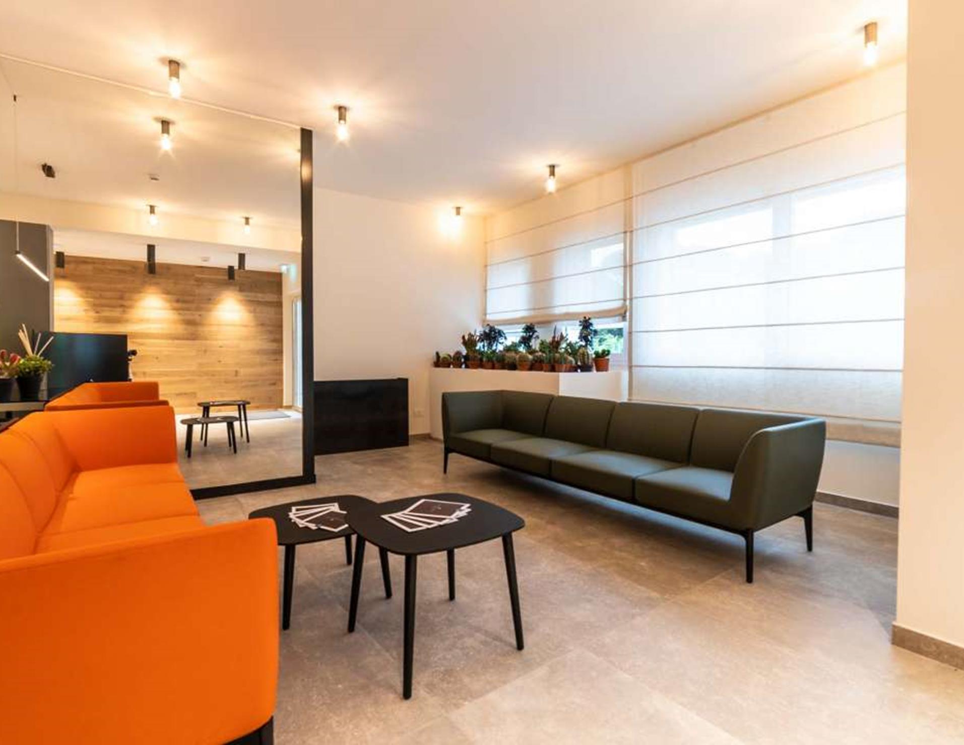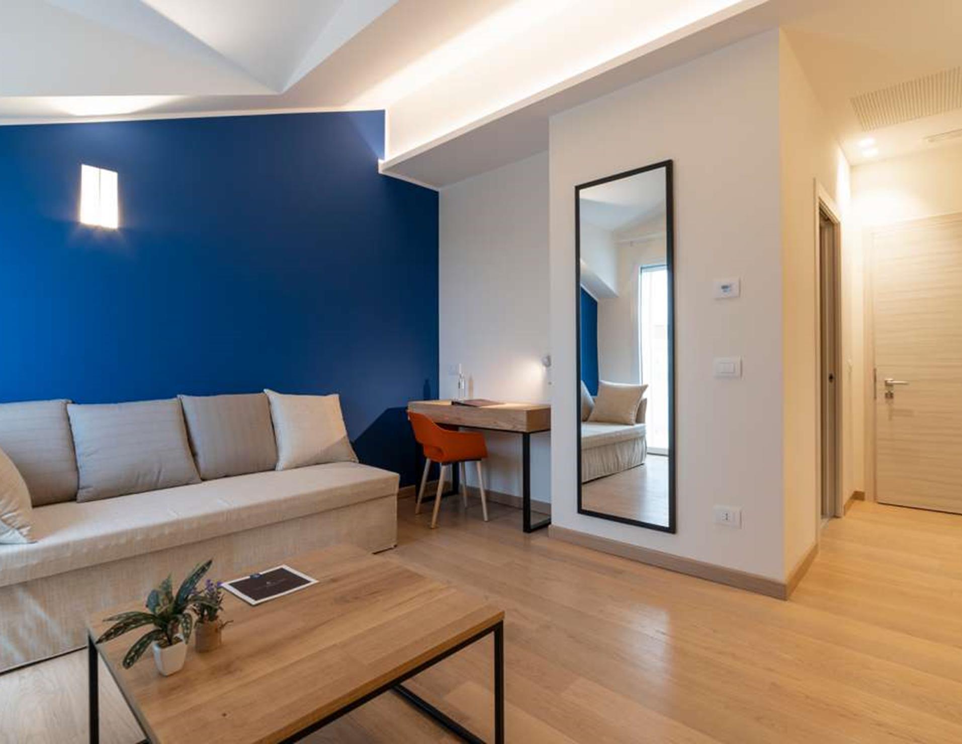 Appartamenti: 12, Trilocali moderni e confortevoli, di nuova realizzazione, dislocati al piano terra e al primo piano. Dotazioni: servizi con doccia, phon, Wi-Fi, TV-Sat, angolo cottura, forno, lavastoviglie, riscaldamento e aria condizionata.